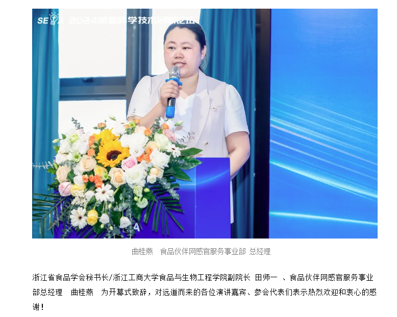 2024年5月15日,由食品伙伴網和浙江省食品學會聯(lián)合主辦,全球化學感官研究聯(lián)盟(GCCR)、湖北省照明學會、西安交通大學第二附屬醫(yī)院、上海盛評檢測技術有限公司協(xié)辦,濟南智感分析儀器有限公司、煙臺食邦信息科技有限公司、感知網共同支持的“2024 感官科學技術創(chuàng)新論壇”在杭州萬信瑞鉑酒店盛大開幕!