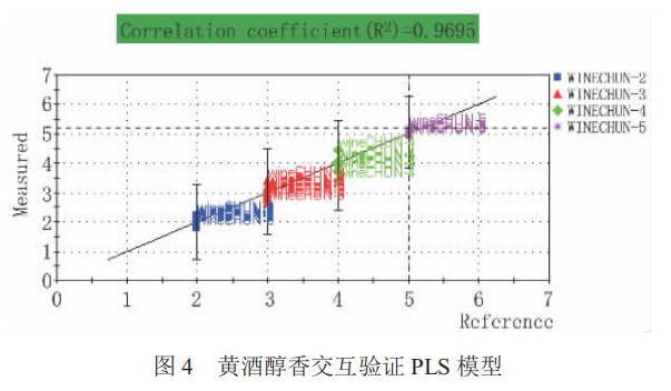 從表 1 可以看出, 所有樣品的醇香得分經交互驗證顯示,驗證準確率為 97.3 %。其中 25 號樣品醇香分值為5 分的酒樣,其預測得分略高,查得此樣品為 40 年陳釀,而 31 號樣品醇香分值為 5 分,預測結果相對接近,查得此樣品為 20 年陳釀。這可能是由于二者年份上的差異加上評分機制最高為 5 分,而導致預測結果略有偏離。在實際感官品評時,不影響其得到最高分值。