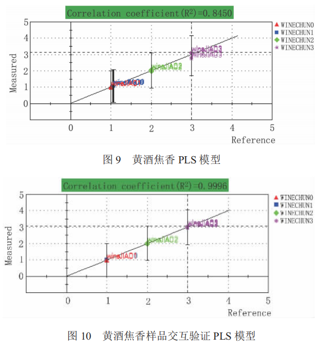 建立焦香 PLS 定量模型,2 個定量模型的相關系數分別為 0.9985 和 0.9998,線性關系良好,見圖 9 和圖 10。進行交互驗證后的數據見表 3。