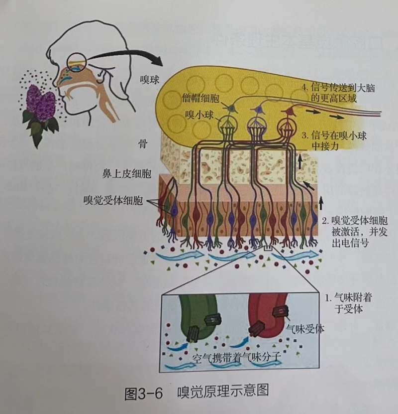 人的嗅覺感受器主要是鼻腔,不規則形狀,面積為2.7-5.0?,其上布滿了嗅細胞,嗅細胞是嗅感受體最重要的組成部分。在嗅細胞上有兩種神經纖維,一種是嗅覺神經纖維末梢(嗅毛),另一種是三叉神經末梢,都是氣味分子的直接受體。