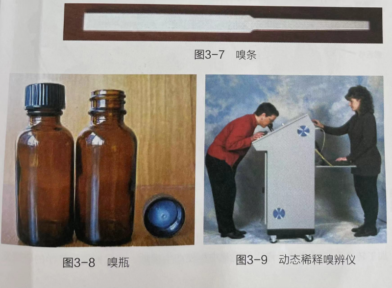 常見氣味辨識可以盛裝嗅聞物質的嗅瓶或蘸取嗅聞物質的嗅條為工具開展(圖3-7和圖3-8),嗅覺網值測定則可采用動態稀釋嗅辨儀(圖3-9)。