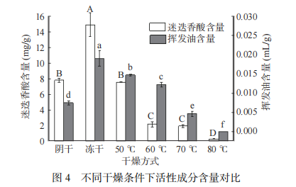 結(jié)果:1.常溫陰干、冷凍干燥以及溫度在50~70℃間的干燥得到的干燥紫蘇均能滿足藥典標準,其中凍干品不論是紫蘇葉還是紫蘇莖的活性成分含量均為最高。