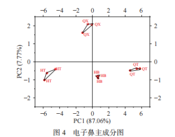 如圖4所示:四個部位樣品能夠獨立區分出來,說明電子鼻能夠辨別樣品氣味特征,且PC1貢獻率為87.06%、PC2貢獻率為7.77%,說明大量有效信息存在于第一主成分。可以判斷,樣品HT、HB、QT氣味特征相近,樣品QX氣味特征與其他部位差異較大。