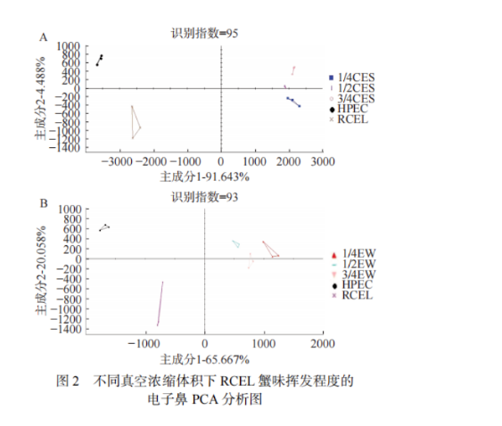 當真空濃縮體積分別濃縮至原體積的3/4、1/2、1/4時,停止旋轉蒸發過程,得到CES,同時收集EW,分別記為3/4CES、1/2CES、1/4CES;3/4EW、1/2EW、1/4EW。最后將3/4CES、1/2CES、1/4CES;3/4EW、1/2EW、1/4EW以及RCEL進行電子鼻PCA分析。