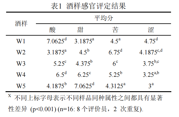 對五種櫻桃酒的感官屬性(酸、甜、苦、澀)進行感官評定,結果如表 1 所示。由表 1 可知,W1 的酸味和澀感最強,但甜味值最低。W2 的苦味值最大,酸味值最小。W5 甜味值最大,而澀值最小。相比較而言,W3 和 W4 的味覺和口感強度均處于中等強度。