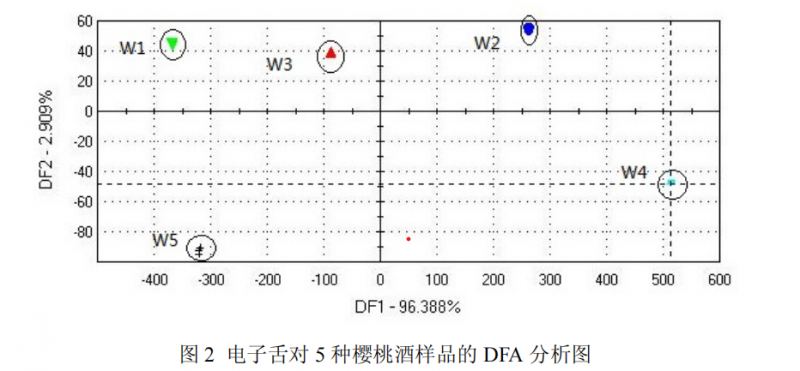 將電子舌采集得到的數據進行 DFA 分析,結果如圖 2 所示。由圖 2 可知,DFA 對櫻桃酒樣品的累積區分指數達到了 99.297%(DF1 為 96.388% ,DF2 為 2.909%),DFA 法能夠對樣品間差異有更好的區分度,并且同一樣品組內的離散度也比 PCA 法(圖 1)的小,不同樣品組間的區分更明顯。
