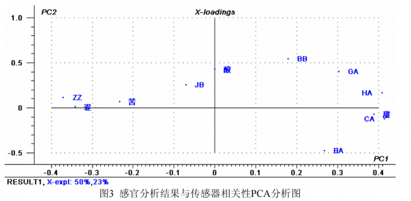 對感官分析結果與電子舌數據進行PCA相關性分析,如圖3所示。主成份1和2反映了樣品的大都分信息,在圖上距離越近,說明樣品與傳感器的相關性越強。由圖3 可知,傳感器ZZ與澀、苦味的相關性較好,傳感器JB與酸味相關性較強,而傳感器HA、CA與甜味的相關性較好。