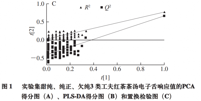 為探索電子舌檢測能否用于工夫紅茶茶湯滋味的判別,以電子舌7 個傳感器響應值為X變量,以茶湯滋味分組(甜純、純正、欠純)為Y變量做PLS-DA。PLS-DA是一種有監督的模式識別方法,相對于PCA所得的投影通常可獲得更好的分類效果。如圖1B所示,3 類(甜純、純正、純)茶湯的聚類結果類似于PCA的結果(R2x =1,R2Y =0.61,Q2 =0.512)。Q2 大于0.5,表明模型具有較好的預測能力。過擬合是PLS-DA模型的一個常見問題。為進一步驗證PLS-DA模型的可靠性,對該模型進行置換檢驗驗證(圖1C)。將模型建立時定義的Y矩陣的變量隨機排列100 次,得到R2和Q2 截距分別為(0.0,0.029)和(0.0,-0.399),表明PLS-DA模型穩定可靠,未存在過擬合,可用于不同滋味的判別。