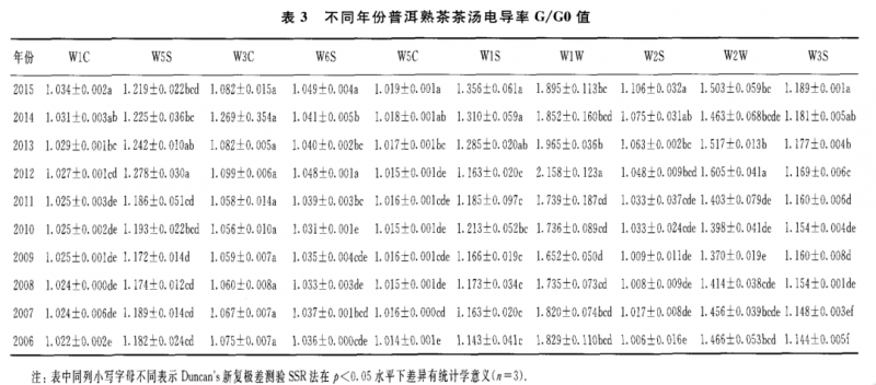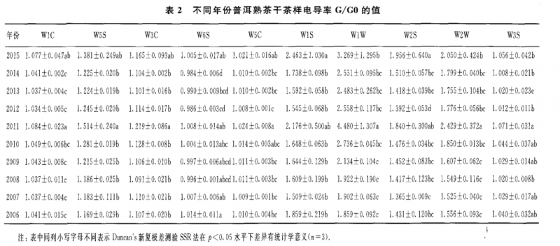 表 2至表 4為 10 個(gè)不同年份普洱熟茶的干茶、茶湯和葉底的具體的電導(dǎo)率 G/GO值。從表 2可知,對(duì)干茶香氣 G/GO值最大的傳感器是 w1w 和 W1S,其次是 w2w 和 W2S,其他 6個(gè)傳感器的 G/GO值較低;對(duì)茶湯香氣 G/GO值最大的傳 感器是 w1w 和 w2w ,其次是 W1S和 W5S,其他 6個(gè)傳感器的 G/GO值較低(表 3);葉底香氣 G/G0值的貢獻(xiàn)率大小順序與茶湯的相同,即為傳感器 w1w>w2w >w1s>w 5s(表4)。由表1所示的10個(gè)傳感器的性能可知,W1S傳感器對(duì)甲烷類揮發(fā) 性成分敏感,w1w ,w2w ,W2S和W 5S分別對(duì)硫化物,芳香成分、有機(jī)硫化物 ,乙醇和氮氧化合物等揮發(fā)性成分敏感。另外,不同年份普洱熟茶的香氣物質(zhì)不論 是干茶 、茶湯和葉底在其組成上基本一致 ,只是在干茶中乙醇?xì)怏w比和氮氧化合 物更為豐富。總體來(lái)看,上述幾類揮發(fā)性成分的含量在干茶中含量最高,茶湯次之 ,葉底最低;其中2011年干茶對(duì) w 1s,w1w ,w2w ,W2S和 W5S傳感器的電導(dǎo)率基本上是所有茶樣中最高的。隨著貯藏年份的增加,上述幾類揮發(fā)性成分的含量 在干茶和茶湯中呈顯著的上升趨勢(shì),在葉底中呈顯著的下降趨勢(shì)。