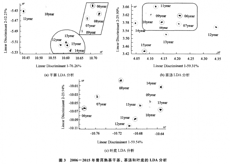由 LDA判別因子分析圖(圖 3)可知,10個(gè)不同年份普洱熟茶干茶 (圖 3a)的LinearDiscriminant1和LinearDiscriminant2的貢獻(xiàn)率分別達(dá)到 76.26% 和 12.25% ,兩判別式的總貢獻(xiàn)率為 88.51%,相互之問(wèn)都能明顯的區(qū)分,香氣的數(shù)據(jù) 采集點(diǎn)有不同的分布區(qū)域。其中 ,2010年和 2011年茶樣相互之間的距離較遠(yuǎn),2006—2009年的 4個(gè)茶樣分布在距離較近的同一區(qū)域,2012~2015年 4個(gè)茶樣也 同樣分布在距離較近的同一區(qū)域,且兩區(qū)域相互間距離較近,但兩區(qū)域距離 2010年和 2011年的區(qū)域較遠(yuǎn),且 2013年 和 2015年存在重疊現(xiàn)象,說(shuō)明儲(chǔ)藏年份相近 的普洱熟茶干茶中可能含有共同的香氣物質(zhì),同時(shí)也說(shuō)明隨著儲(chǔ)藏年份的增加香氣成分會(huì)產(chǎn)生明顯的變化,也說(shuō)明 LDA法可以區(qū)分不同儲(chǔ)藏年份的普洱熟茶,與 PCA 的分析結(jié)果相互驗(yàn)證 。茶湯 (圖 3b)的 LinearDiscriminant1的貢獻(xiàn)率達(dá)到 59.3l% ,LinearDiscriminant2的貢獻(xiàn)率達(dá)到 29.90%,兩判別式的總貢獻(xiàn)率為 89.21% 。從圖 3b可以看出,除 2012年和 2015年的茶湯香氣數(shù)據(jù)采集點(diǎn)相互之問(wèn)的距離較遠(yuǎn)外,其余的幾個(gè)集中分布在離 Y=0最遠(yuǎn)的區(qū)域 ,且各個(gè)茶樣都沒(méi)有存在重 疊現(xiàn)象,說(shuō)明茶湯的香氣存在差異,且區(qū)分效果比干茶好葉底 (圖 3c)的LinearDiscriminant1和 LinearDiscriminant2的貢獻(xiàn)率分別達(dá)到 59.54% 和 23.94% ,兩判別式的總貢獻(xiàn)率為83.48% ,相互之間都能明顯的區(qū)分,香氣的數(shù)據(jù)采集點(diǎn)有不同的分布區(qū)域,且儲(chǔ)藏年份相近的茶樣分布在同一區(qū)域,說(shuō)明儲(chǔ)藏年份 相近的普洱熟茶葉底中可能含有共同的香氣物質(zhì),同時(shí)也說(shuō)明隨著儲(chǔ)藏年份的增加 香氣成分會(huì)產(chǎn)生明顯的變化。綜上所述,無(wú) 論是PCA 分析還是 LDA分析,都能將 普洱熟茶香氣較好地區(qū)分開,且 PCA 分析結(jié)果明顯優(yōu)于 LDA 分析結(jié)果,而且年份 差別越大,分離效果越好。