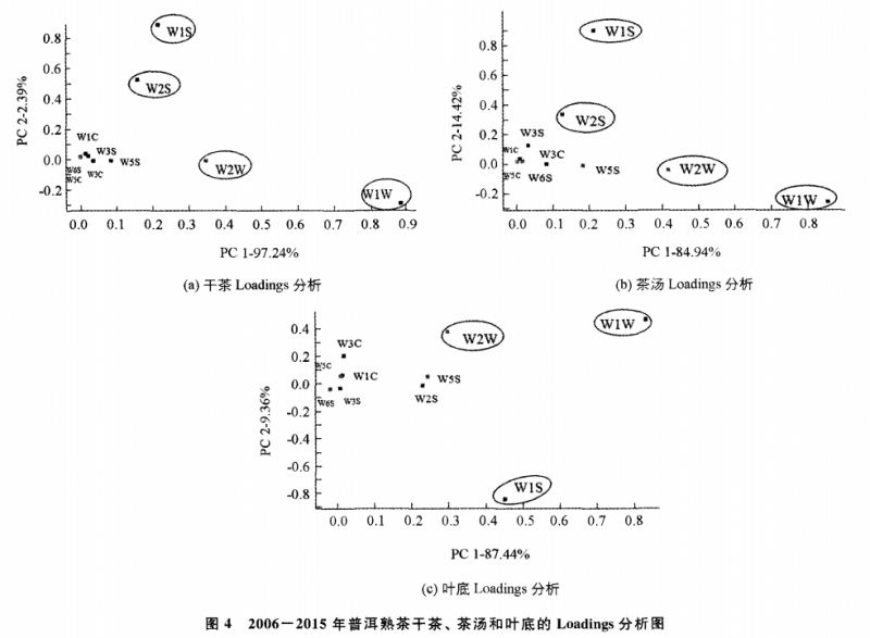 本研究中的Loadings分析法主要是對(duì)傳感器進(jìn)行研究,利用該方法可以確認(rèn)特定試 驗(yàn)樣品下各傳感器對(duì)樣品區(qū)分的貢獻(xiàn)率大小,從而考察在樣品區(qū)分過(guò)程中哪一類氣 體起了主要區(qū)分作用。干茶的 Loadings分析結(jié)果如圖 4a,傳感器 w1w (對(duì)硫化物 敏感 )的位點(diǎn)距離x=0最遠(yuǎn),說(shuō) 明 W1W 對(duì)第一主成分的貢獻(xiàn)率最大,傳感器 W2W (對(duì)芳香成分 、有機(jī)硫化物靈敏 )次之;而傳感器W1s(對(duì)甲烷敏感 )的位點(diǎn)距離 y=0最遠(yuǎn),說(shuō)明其對(duì)第二主成分貢獻(xiàn)率最大,傳感器 w2s(對(duì)乙醇敏感 )次之。茶湯的 Loadings分析結(jié)果如圖 4b,傳感器對(duì)主成分的貢獻(xiàn)率與干茶的完全相同,即 w1w 對(duì)第一主成分的貢獻(xiàn)率最大,傳感器 w2w 次之;而傳感器 w1S對(duì)第二主成分貢獻(xiàn) 率最大,傳感器 W2S次之。葉底的 Loadings分析結(jié)果如圖 4c,傳感器 w1w 的位 點(diǎn)距 x=0和 y=0都較遠(yuǎn),說(shuō)明其對(duì)第一、第二主成分的貢獻(xiàn)都較大,而 w2w 距y=0最遠(yuǎn),說(shuō)明其對(duì)第二主成分貢獻(xiàn)率最大,傳感器 w1s對(duì)第一主成分的貢獻(xiàn)次于 w1w。
