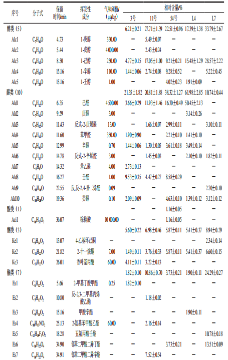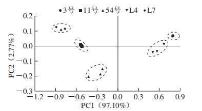 金針菇品種繁多,并且各種新品種不斷研發栽培。不同品種金針菇的生長特性、出菇特性、商品性狀和生物轉化率不同,而風味物質也存在各自的差別和獨特之處。本研究采用SPME-GC-MS和電子鼻分析5個品種金針菇揮發性物質,由定量分析、PCA、HCA探究不同品種金針菇揮發性物質差異,并通過SPME-GC-MS結合電子鼻進行PCA對比品種鑒定準確率。 5個金針菇樣品組(3號、11號、54號、L4和L7),測定前將樣品用液氮研磨。 用液氮研磨后,準確地稱量2.0g金針菇樣品于20mL頂空瓶中。將DVB/CAR/PDMS型萃取頭在250℃活化20min后,在60℃水浴中進行靜態吸附萃取40min,將萃取頭放入GC進樣口解吸。 以正構烷烴的實際測量值校正保留時間,SPME-GC-MS測定結果通過NIST98數據庫(NIST08,華盛頓特區)進行檢索,取匹配度80%以上的揮發性成分;以2-氯苯甲醛為內標物對各化合物進行定量分析。 用液氮研磨后,精確稱取2.0g金針菇樣品于20mL頂空瓶內。樣品測量流速150mL/min,檢測時間120s。電子鼻配備12個不同的氣體傳感器:LY2/LG、LY2/G、LY2/AA、LY2/GH、LY2/gCTL、LY2/gCT、T30/1、P10/1、P10/2、P40/1、T70/2和PA/2,通過傳感器陣列響應和模式識別技術對揮發性氣體分子進行分析。 利用相對氣味活度值(relativeodoractivityvalue,ROAV)評定各揮發性化合物對樣品總體氣味的貢獻,定義對樣品風味貢獻最大的組分:ROAVstan=100,則其他揮發性化合物的ROAV小于100,按下式計算: