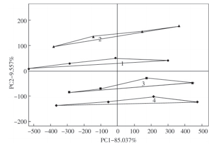 圖5 電子舌檢測不同菌菇魚松的PCA分析圖譜