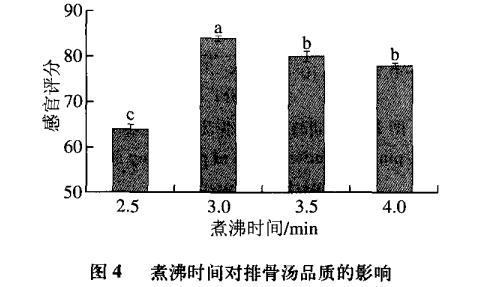由圖4可知,隨著湯汁煮沸時間的增加 ,排骨湯的感官評分呈先升高后降低的趨勢。當煮沸時間為3min時,排骨湯的感官評分最高,且與其他煮沸時間有顯著性差異 (P<0.05)。