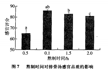 由圖7可知 ,隨著湯汁熬制時間的增加,排骨湯的感官評分呈先升高后降低的趨勢。當熬制時間為1.0h時,排骨湯的感官評分最高,與熬制0.5h和 1.5h的樣品沒有顯著差異 (P>0.05),但與熬制2.0h的樣品存在顯著差異 (P<0.05)。