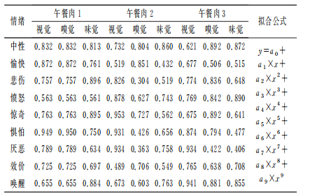 人們對食物是否可口的判斷也是持續變化的過程,這個過程包括食物外觀質地的判斷、氣味的甄別和口感的體驗等,因此圖3~圖5分別從視覺、嗅覺和味覺3個方面,持續觀察了感官評價人員的情緒變化。由圖3~圖5可知,擬合曲線的變化趨勢與實際變化趨勢一致,由表2可知,缺失值較少的曲線擬合效果較好。同時圖3~圖5中也分析了實驗人員的情緒效價和喚醒因素。
