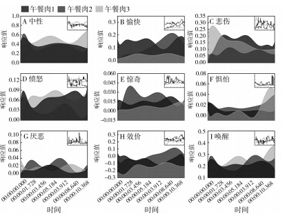 實驗人員觀察3種午餐肉時,情緒喚醒響應值維持在0.3左右,機體對樣品的反應強度類似。“中性”表示未引起實驗者情緒表達,“中性”值越高,情緒表達越低。“愉快”和“驚奇”的響應值越高,越能說明樣品的可接受度高;而“悲傷”、“憤怒”、“懼怕”和“厭惡”的響應值越高,說明樣品的可接受度越低。為了描述便利,本文將“中性”標為情緒壓制,“愉快”和“驚奇”2種情緒稱為積極情緒,“悲傷”、“憤怒”、“懼怕”和“厭惡”4種情緒稱為消極情緒。從視覺上分析,午餐肉2引起實驗者的情緒表達最高,午餐肉1最低;午餐肉3的積極情緒響應值明顯低于另外兩種,而午餐肉1比午餐肉2更能使人感到愉悅。從觀測時間上看,午餐肉1“愉快”響應值突降的時間正是午餐肉2“驚奇”響應值陡增的時間,說明情緒的分配是不平衡的,也可以反映出隨著觀察深入,午餐肉2的某些特征更能獲取實驗者的青睞。從消極情緒上看,3種午餐肉“憤怒”和“厭惡”的響應值接近,而“悲傷”和“懼怕”的響應值差異更顯著,而這兩種消極情緒都表明午餐肉3的接受度最低,午餐肉2的接受度最高。此結論和傳統的感官評價結論一致,都表明午餐肉2的外觀更能讓人相信食物“美味”。