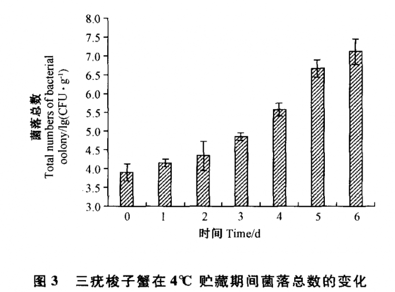 由圖 2可知,TVB-N 含量在貯藏初期變化緩慢,這是由于低溫 (4℃)和真空包裝條 件抑制了蟹肉中微生物的生長和繁殖,導(dǎo)致貯藏前期TVB-N含量增長緩慢 。從貯 藏第 4天開始TVB-N含量顯著上升,含量由34.44mg·100g-1 上升到貯藏第 6 天 的 60.76mg·l00g-1。GB2733—2005 規(guī)定新鮮海蟹的TVB-N含量值應(yīng)低于 25mg·100g-1,貯藏第 3天蟹肉的TVB-N含量為 22.26mg·100g-1,仍屬于新鮮蟹 肉,貯藏第 4天蟹肉的TVB-N含量高于規(guī)定標準,已腐敗變質(zhì),由此表明 TVB-N 可 以反映蟹肉鮮度的變化 。