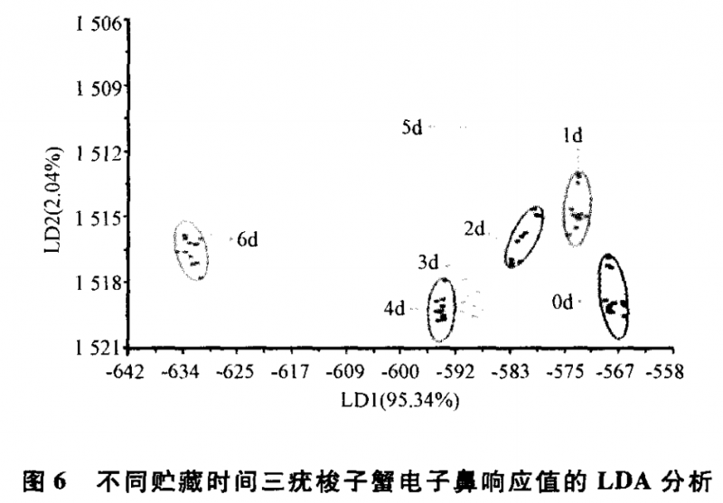 LDA能夠最大限度地區(qū)分不同的樣本集,在降低數(shù)據(jù)空間維數(shù)的同時最大限度地減少信息丟失。由圖 6可知,判別式 LDI的貢獻率是 95.34% ,判別式LD2的貢獻率 是 2.04% ,2個判別式的總貢獻率為97.38% ,大于 95% ,說明第 1 和第 2 主成分構(gòu)成的二維平面足以表征不同冷藏時間下梭子蟹氣味的差異。此外,從右到左 依次是貯藏第 0、第 1、第 2、第 3、第 4、第 5、第 6天的梭子蟹氣味數(shù)據(jù),它們均能被很好地分開,說明不同貯藏時間的梭子蟹的揮發(fā)性氣味成分存在顯著差異。與圖 5相比,圖 6中貯藏前期的點相對集中,隨著時間延長,點之間的距離增加,反映了蟹肉在貯 藏過程中產(chǎn)生的揮發(fā)性物質(zhì)濃度隨貯藏時間的延長差異性越顯著 ,且揮發(fā)性物質(zhì)濃度與貯藏時間呈線性變化。這種差別可能是由 PCA 和 LDA 本身決定的,PCA適于分析以方差形式體現(xiàn)的數(shù)據(jù)分類信息,而 LDA在數(shù)據(jù)輸入映射到坐標軸時,利用了數(shù)據(jù)內(nèi)部的分類信息,使得類別內(nèi)部的點更集中。