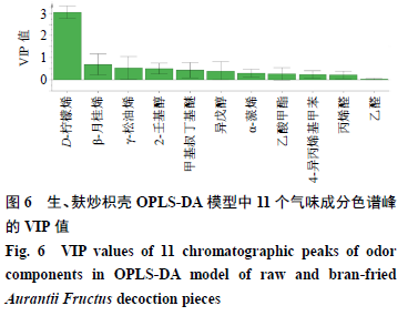 在得到生、麩炒枳殼飲片氣味成分信息的基礎(chǔ)上,為進一步分析得出氣味差異標(biāo)志物,以11個氣味成分所對應(yīng)的色譜峰峰面積為變量,采用SIMCA 14.1軟件建立生、麩炒枳殼OPLS-DA模型,分析得到11個成分的VIP值,結(jié)果見圖6。VIP值越大,表明該成分對區(qū)分生、麩炒枳殼飲片的貢獻越大。由圖6可知,對區(qū)分生、麩炒枳殼飲片貢獻較大的前3個成分是D-檸檬烯、β-月桂烯和γ-松油烯,且這3個成分也是多數(shù)學(xué)者研究[19-20]有報道的枳殼揮發(fā)油組成成分,結(jié)合枳殼麩炒前后揮發(fā)性成分含量變化情況,初步推測這3個成分為區(qū)分生、麩炒枳殼飲片的氣味差異標(biāo)志物。