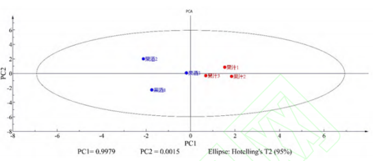 圖5 百香果果汁及果酒中的主成分分析結果