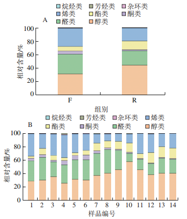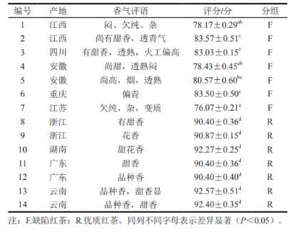 依據(jù)專家感官審評(píng)結(jié)果(表1)將14個(gè)茶樣分成兩類:優(yōu)質(zhì)紅茶組,用R表示(7個(gè));缺陷紅茶組,用F表示(7個(gè))。優(yōu)質(zhì)紅茶組香氣特征主要呈現(xiàn)甜香、甜花香等,從香氣評(píng)分來看,優(yōu)質(zhì)紅茶香氣評(píng)分均高于90分。缺陷紅茶組香氣主要表現(xiàn)為熟悶、不純、駁雜、青草氣強(qiáng)、火工偏高等,其評(píng)語中以“偏、透、欠”等傾向性強(qiáng)的副詞修飾較多,從香氣評(píng)分來看缺陷紅茶評(píng)分則低于85分,。綜上分析可知,兩類紅茶香氣品質(zhì)存在明顯差異性。