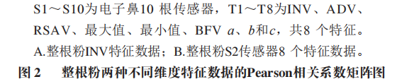 特征變量之間存在高沖突數(shù)據(jù)會(huì)影響特征融合數(shù)據(jù)的可靠性,繼而會(huì)影響分類模型建模結(jié)果,而Pearson相關(guān)系數(shù)在度量數(shù)據(jù)之間的沖突程度上表現(xiàn)良好。以整根粉10 根傳感器響應(yīng)值的INV特征數(shù)據(jù)和整根粉單個(gè)傳感器S2響應(yīng)值的8 個(gè)特征數(shù)據(jù)為例分析特征數(shù)據(jù)之間的冗余程度。圖2是這兩種不同維度數(shù)據(jù)各自的Pearson相關(guān)矩陣,其中相關(guān)系數(shù)的絕對(duì)值越接近1,說明二者之間的相關(guān)性越大;相關(guān)系數(shù)的大小在圖中用橢圓形球的寬窄和顏色表示,正負(fù)用橢圓形球的左偏和右偏表示。由圖2A可知,除S7、S9傳感器外,其余8 個(gè)傳感器之間都存在大量冗余信息;由圖2B可知,除了最大值特征T4和BFV b特征T7外,其余6 個(gè)特征數(shù)據(jù)之間存在大量冗余信息。所以,需要對(duì)特征數(shù)據(jù)進(jìn)行特征降維提高分類模型的精度。