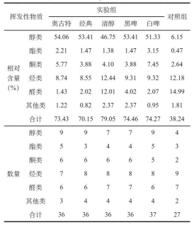 4.GC-MS結果分析通過GC-MS測定不同種類啤酒制作啤酒鴨樣品的風味物質及其相對含量。各樣品鑒得醇類、酯類、醛類、酮類、烴類以及其他類(醚類、含氮類及呋喃等)揮發性化合物,其中來源于啤酒的醇類物質占據實驗組最重要位置。由表3可知,實驗組所檢測的揮發性化合物,各樣品風味物質含量皆不同,但醇類和烴類都為其主要化合物,種類及含量皆高于對照組。