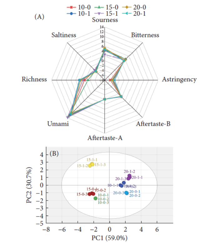 添加孜然的烤羊肉餅苦味和酸味下降,說明孜然可能通過釋放特有的揮發性風味化合物掩蓋或混合令人不愉快的味道。PC1和PC2的貢獻率分別為59.00%和30.70%,累積方差貢獻率為89.70%(>85%),說明PC1和PC2能夠反映大量有關樣本整體特征的信息。