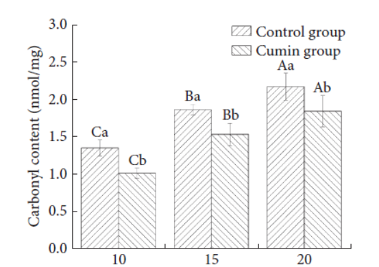 隨著烤制時間的延長,蛋白質羰基含量顯著增加。添加孜然后,羊肉的羰基含量顯著低于對照組,這可能是由于孜然中的黃酮類、萜烯醛類和萜烯類具有抗氧化活性,抑制了烤羊肉蛋白質的氧化。