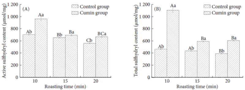 圖5 孜然對活性巰基(A)、總巰基(B)含量的影響