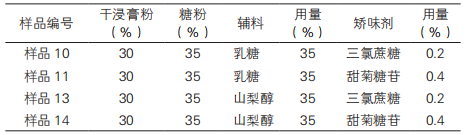 表1 三氯蔗糖與輔料矯味組合味覺信息測定值的均值 ± 標準差、95% 置信區間表2甜菊糖苷與輔料矯味組合味覺信息測定值的均值 ± 標準差、95% 置信區間表3阿斯巴甜與輔料矯味組合味覺信息測定值的均值 ± 標準差、95% 置信區間根據表1~3,選出甜味、鮮味、鮮味回味較高值的樣品,苦味、苦味回味、澀味、澀味回味較低值的樣品,即選出樣品 10、11、13、14 共 4 個樣品作為進一步研究的對象,篩選結果見表4。