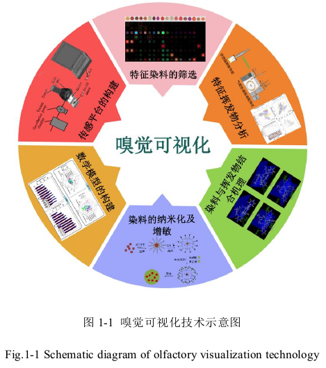 嗅覺可視化技術本質上是一種新型的電子鼻技術,于2000年由美國伊利諾伊州立大學的NealA.Rakow教授和KennethS.Suslick教授首次提出。這項技術主要依賴于各種化學染料組成的可視化傳感器陣列對樣品中揮發性氣體的化學響應。這些化學染料通過分子間的相互作用(π-π鍵和金屬鍵的作用、酸堿相互作用以及電荷轉移等)來與氣體中的小分子結合,并且必須具備兩個條件:(1)染料中必須存在一個與氣體中小分子強相互作用的中心;(2)染料在接觸小分子氣體時會發生顏色變化。