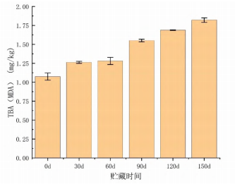 過氧化值是反映油脂氧化的重要指標(biāo),不同貯藏期的POV值如圖1所示。在-18℃條件下,預(yù)制紅燒肉的過氧化值隨貯藏時(shí)間增加而增長,其中只有60d和150d有明顯增加。不同貯藏時(shí)期的TBA反應(yīng)物值如圖2所示,TBA值隨貯藏時(shí)間顯著上升(P<0.05),貯藏0d的MDA含量約為1.07mg/kg,貯藏150d后,MDA含量增加到1.75mg/kg,這是因?yàn)檫^氧化物的不穩(wěn)定性質(zhì)會進(jìn)一步的分解為二次氧化產(chǎn)物如丙二醛。但預(yù)制紅燒肉在-18℃條件凍藏150d的過氧化值和丙二醛含量均低于GB10146—2015的限制量,仍保持在安全的范圍內(nèi)。