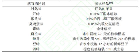 感官評價(jià)人員由4名經(jīng)過1個(gè)月的香氣描述培訓(xùn)的人員組成,感官描述詞由評價(jià)員投票決定。根據(jù)ISO4121-2003標(biāo)準(zhǔn),實(shí)驗(yàn)在20℃恒溫且通風(fēng)的房間內(nèi)進(jìn)行,每個(gè)成員禁止交流,保證不會(huì)互相影響。樣品風(fēng)味按照0~5級評分(0為沒有味道,3為有味道,5為味道非常強(qiáng)烈),感官描述詞最終得分取所有成員的平均分。