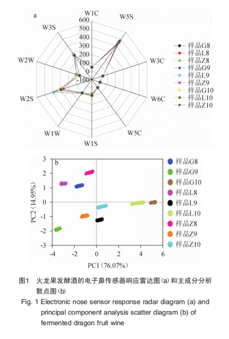 本研究利用智能感官技術(shù)(電子鼻和電子舌)及頂空固相微萃取-氣質(zhì)聯(lián)用技術(shù)(HS-SPME-GC-MS)對(duì)貴州產(chǎn)地(關(guān)嶺、羅甸和貞豐)和采收時(shí)間(8月、9月和10月)的火龍果所釀造發(fā)酵酒的揮發(fā)性風(fēng)味成分進(jìn)行了系統(tǒng)的研究。