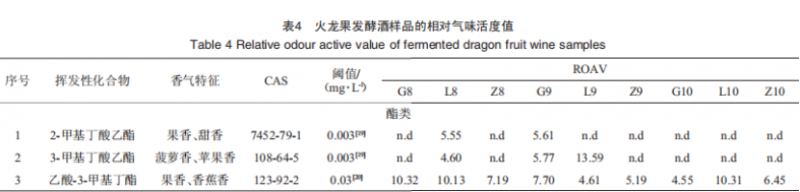 為了進(jìn)一步明確上述主要揮發(fā)性風(fēng)味成分中對(duì)風(fēng)味的呈現(xiàn)有突出貢獻(xiàn)的物質(zhì),對(duì)這些樣品中的揮發(fā)性風(fēng)味成分進(jìn)行ROAV分析,火龍果發(fā)酵酒樣品的ROAV見(jiàn)表4。