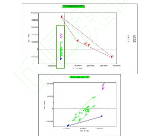 在分析不同種沒藥氣味差異標志物時,比對放大色譜圖以尋找樣品組間的差異往往繁瑣且復雜,這種方法雖然直觀,但效率低下、易出錯。為了簡化這一過程并提高分析的準確性,本研究采用了一種“先統計后化學”的方法。首先,運用PCA對樣品組間的氣味數據進行深入挖掘。PCA能夠迅速定位到樣品間氣味的主要差異所在,通過降維處理,將復雜的數據集簡化為幾個主要的成分,從而更容易識別出差異性色譜峰,在對色譜峰進行了篩選時,要選取那些區分度顯著、峰面積較大且分離效果良好的色譜峰。經過篩選,樣品整體的氣味分布趨勢與未經篩選前保持一致,可以充分證明所選的色譜峰能夠準確地代表樣品整體的氣味特征。接著,借助AroChembase數據庫,對具有顯著差異的色譜峰進行了詳細的定性分析,識別這些色譜峰中可能包含的化合物。