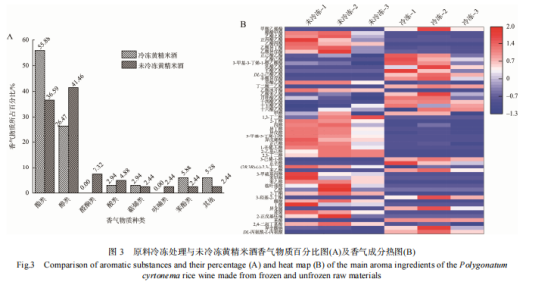 冷凍處理使黃精米酒形成獨特風格,電子舌和電子鼻可區分,獨特風格與酯類增加有關,主要特征物質為乙酸苯乙酯和異龍腦,異龍腦賦予功能活性。