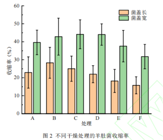 不同熱風干燥方法對羊肚菌菌蓋收縮率的影響如圖2所示。F處理菌蓋長度、菌蓋寬度收縮率最小,其次為E處理和A處理。B處理的菌蓋長收縮率最大,C處理菌蓋寬收縮率最大。